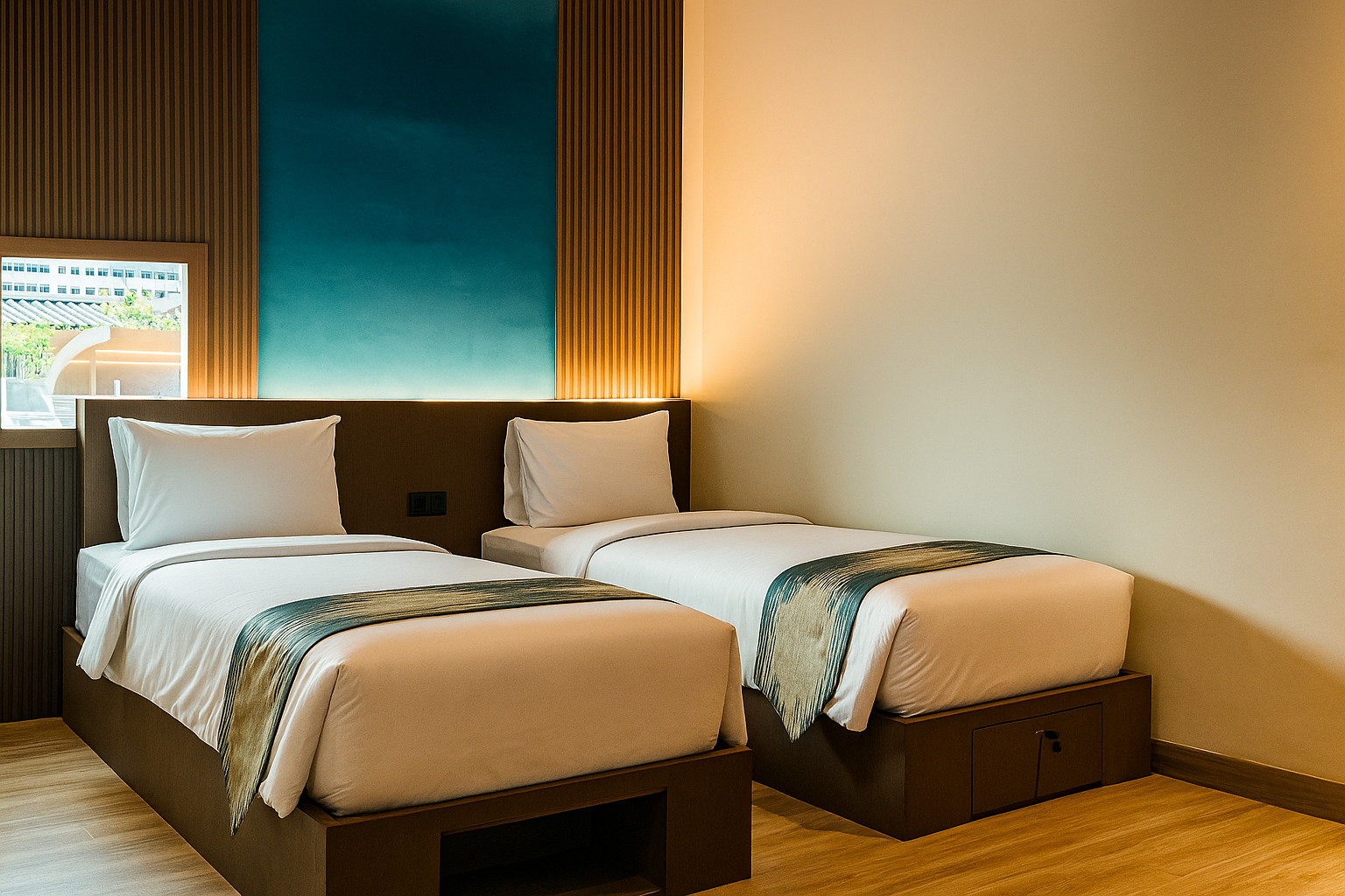 Your perfect space awaits. Choose from our Standard, Deluxe, Executive, or Family Rooms, all featuring a signature blend of retro-modern design and the thoughtful comforts of home.